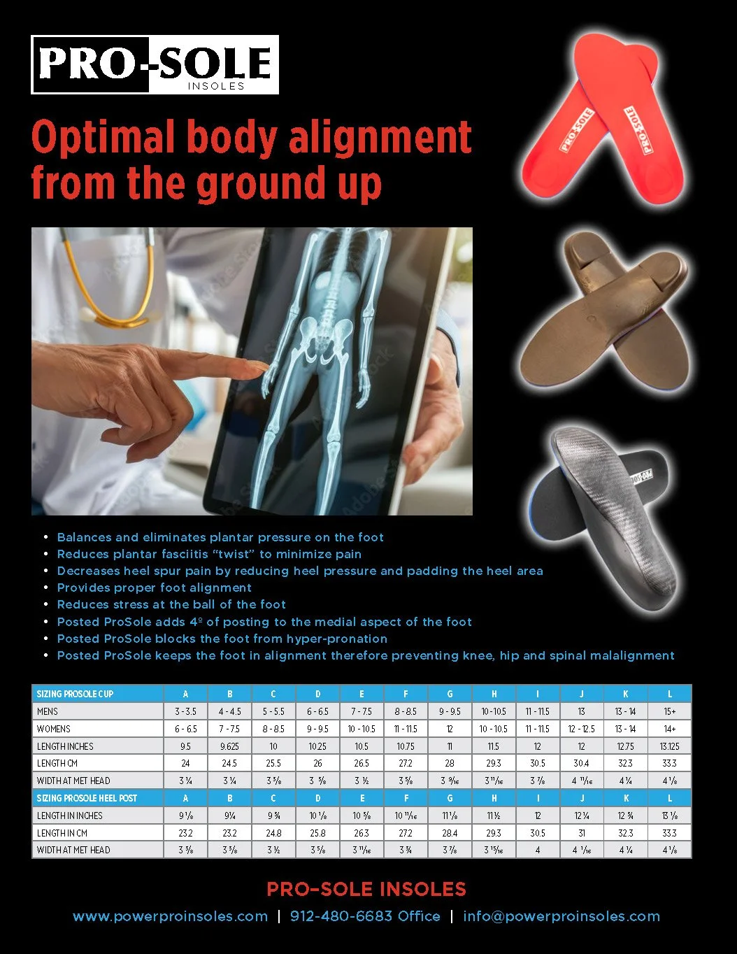 • Posted ProSole keeps the foot in alignment therefore preventing knee, hip and spinal malalignment